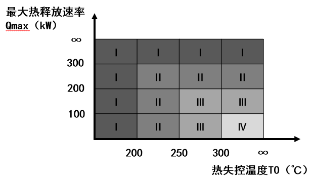 根据电池的热失控温度T0和最大热释放速率Qmax,基于风险矩阵,获得锂离子电池火灾危险性等级,并将电池火灾危险性等级分为极度危险(I)、严重危险(II)、中度危险(III)和轻度危险(IV),如图3.2所示。